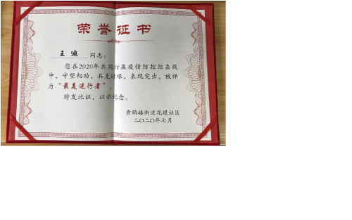 12月3日上(shàng)午9:30時,黃(huang)鶴樓街(jiē)道花堤(di)社區舉(ju)行“最美(měi)志願者(zhě)♍”表彰活(huo)動。王迪(dí)同志作(zuo)為湖北(běi)聖信特(te)種設備(bèi)檢測有(yǒu)限公司(si)的👌一名(ming)黨員,在(zai)抗疫最(zuì)艱難的(de)時刻,主(zhu)動請纓(ying),向戰前(qián)行,用實(shí)際行動(dòng)踐行一(yi)名黨員(yuán)“不忘初(chū)心、牢記(jì)使命,扛(káng)起責任(ren)、經受考(kǎo)驗”的铮(zheng)铮誓言(yan),獲得“最(zuì)美逆行(háng)者”榮譽(yu)稱号。