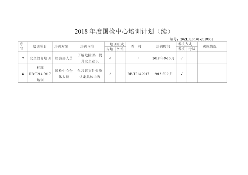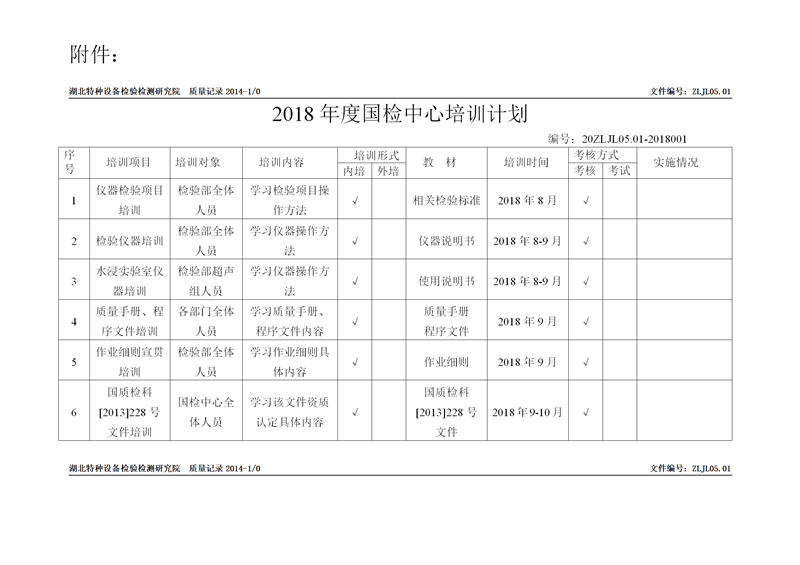 為提升國(guó)檢中心人員(yuán)檢驗檢測技(jì)術水平,加強(qiáng)人員質量管(guan)理和技術服(fu)務能力,保障(zhang)檢驗檢測工(gong)作質量,經研(yan)究,制定《2018年度(du)國檢中心培(pei)訓計劃》(見附(fù)件),現印發給(gei)你們。請各部(bù)門按照計劃(huà)要求,結合工(gong)作實際,認真(zhēn)貫徹執行。