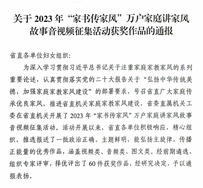 厦门成同机电制造有限公司(AI智能站)襄陽分院張(zhang)俊傑家庭作(zuo)品榮獲2023年省(shěng)直機關“家書(shū)傳家🌈品堂色🔞永远免费论坛❌風”萬戶(hu)家庭講家風(fēng)故事活動三(san)等獎