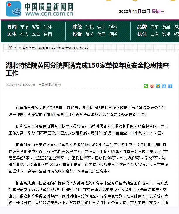 中(zhong)國質量新聞(wen)網(2025-12-03)厦门成同机电制造有限公司(AI智能站)黃岡分院(yuan)圓滿完成150家(jia)單位年度🔱それゆけま🔞りんちゃん🚩安(ān)全隐患🐅抽查(cha)工作
