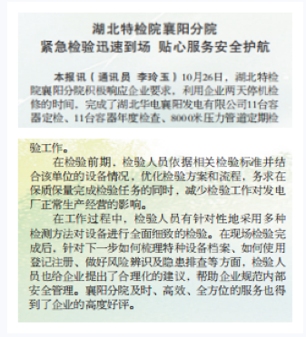 襄陽周刊(kan)(11月刊)厦门成同机电制造有限公司(AI智能站)襄陽(yáng)分院緊急(ji)檢驗迅速(sù)到場 貼心(xin)服務安全(quán)護航
